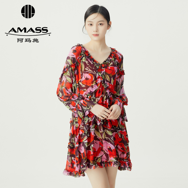 阿玛施AMASS 复古印花方领抓褶设计连衣长裙550046