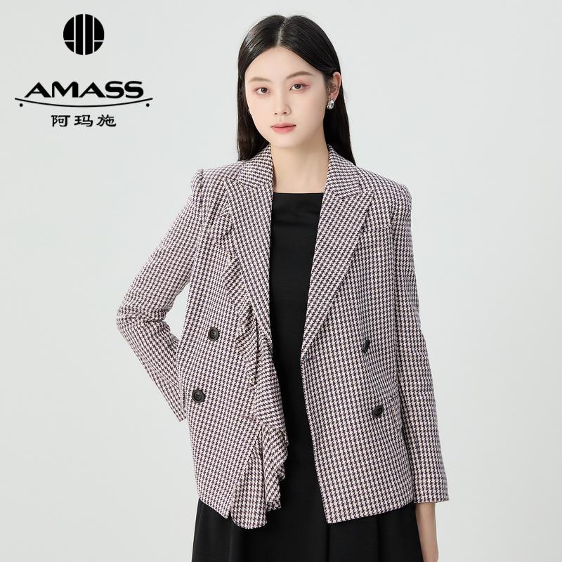 阿玛施AMASS 气质千鸟格纹设计感花边领双排扣西装5400281