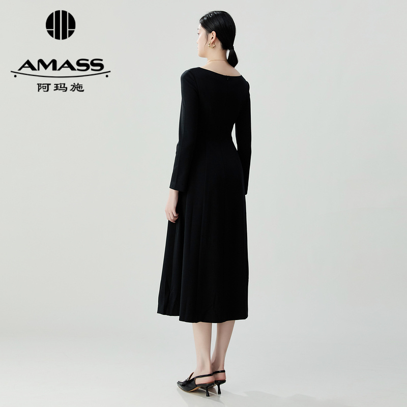 阿玛施AMASS 简约气质羊毛圆领收腰伞裙长袖连衣裙5500564