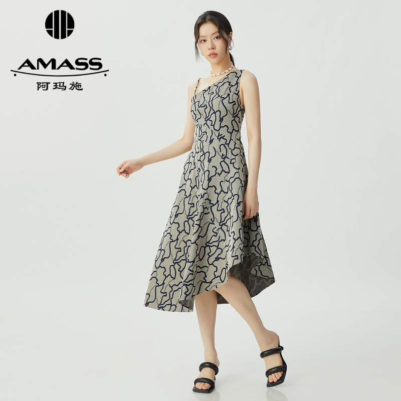 阿玛施AMASS 轻奢款肌理感压花下摆不规则无袖吊带小黑连衣裙5500559