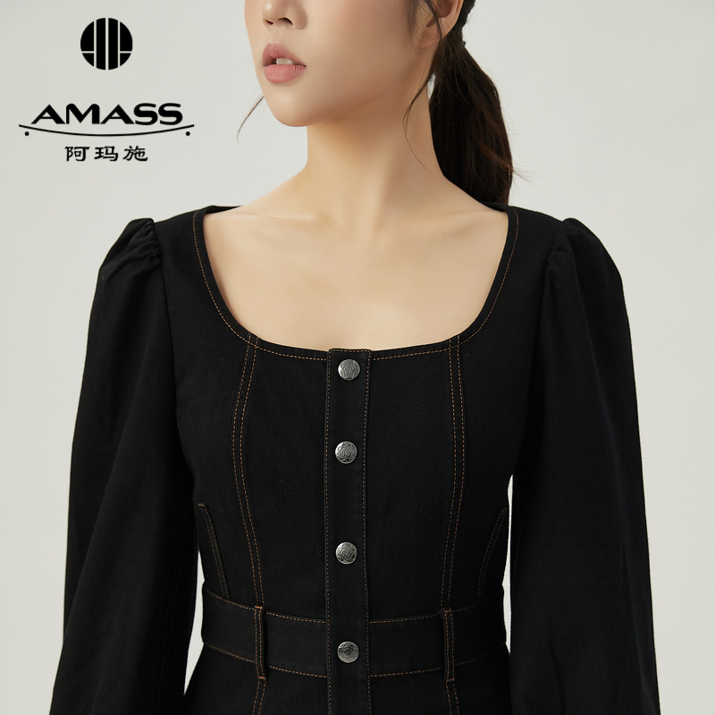 阿玛施AMASS 复古时髦感收腰U领长袖牛仔连衣裙5500509