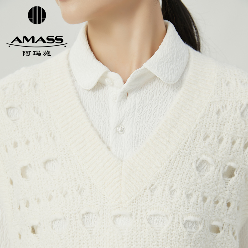 阿玛施AMASS绵羊毛V领镂空宽松学院风减龄纯色针织马甲5399634