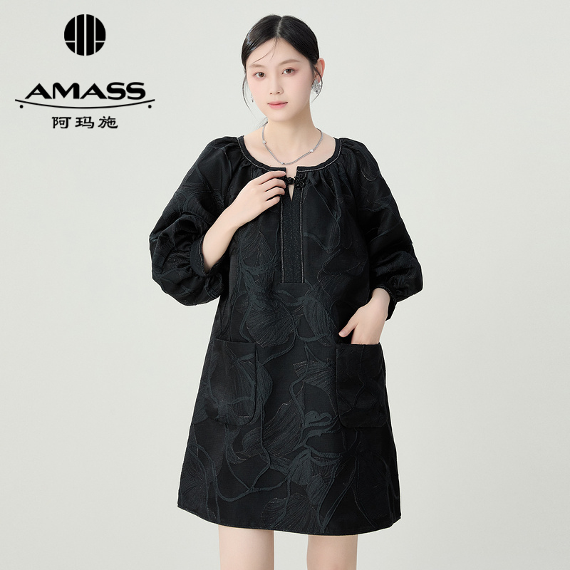 阿玛施AMASS 复古优雅纹理拼接袖口收缩短袖衬衫530007