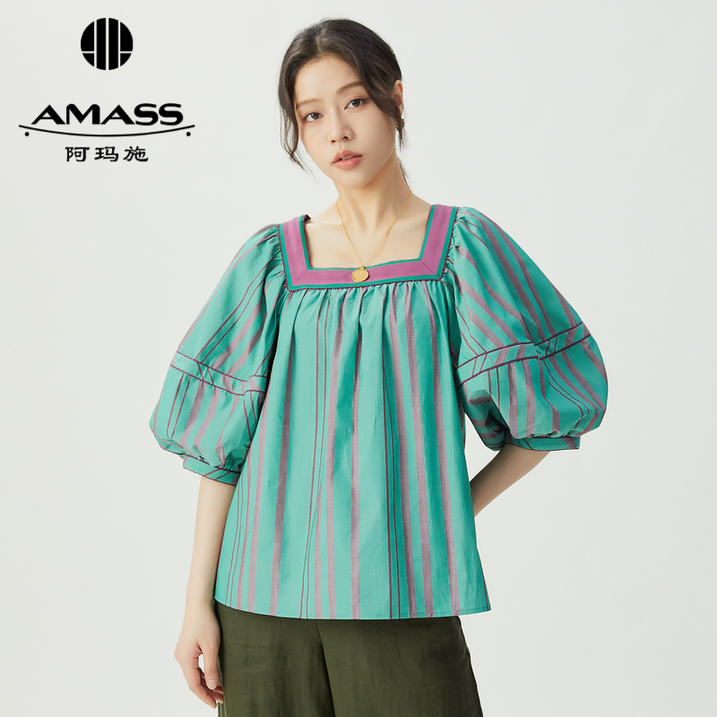 阿玛施AMASS 春夏新款方领减龄泡泡中袖宽松上衣5300627