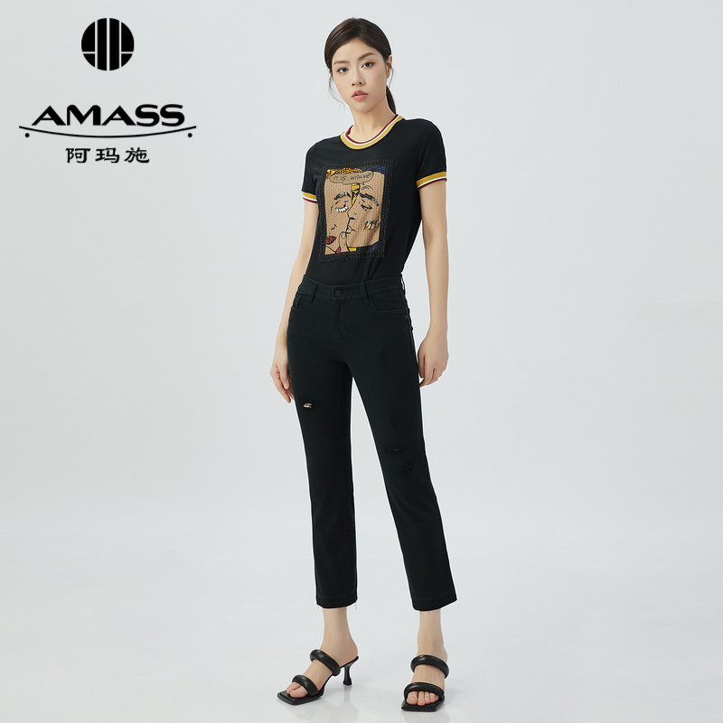阿玛施AMASS中高腰修身时尚微喇破洞牛仔九分裤5100182