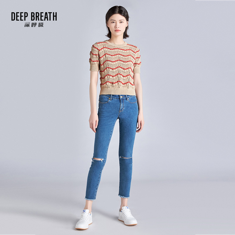 DEEP BREATH深呼吸女装 圆领拼色镂空短袖针织衫A300496