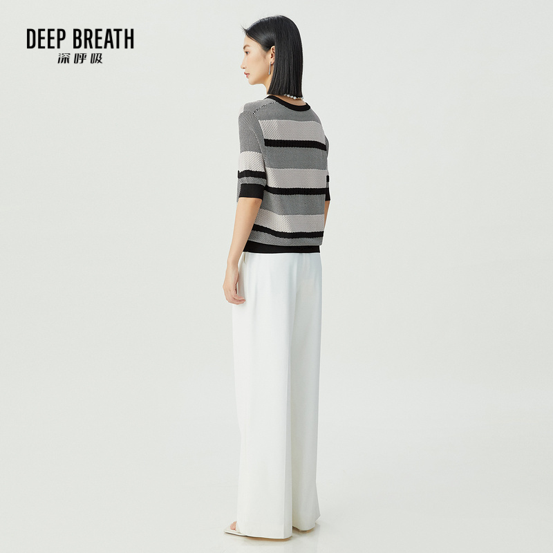 DEEP BREATH深呼吸女装 简约圆领肌理拼色条纹中袖针织衫A301542